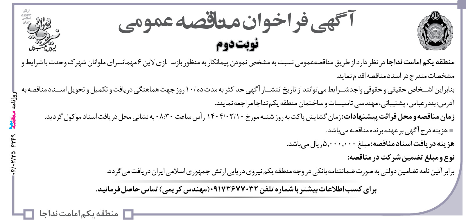 بنابراین اشخاص حقیقی و حقوقی واجدشرایط میتوانند از تاریخ انتشار آگهی حداکثر به مدت ده /۱۰ روز جهت هماهنگی دریافت و تکمیل و تحویل اسناد مناقصه به آدرس: بندرعباس، پشتیبانی، مهندسی تاسیسات و ساختمان منطقه یکم نداجا مراجعه نمایند.
