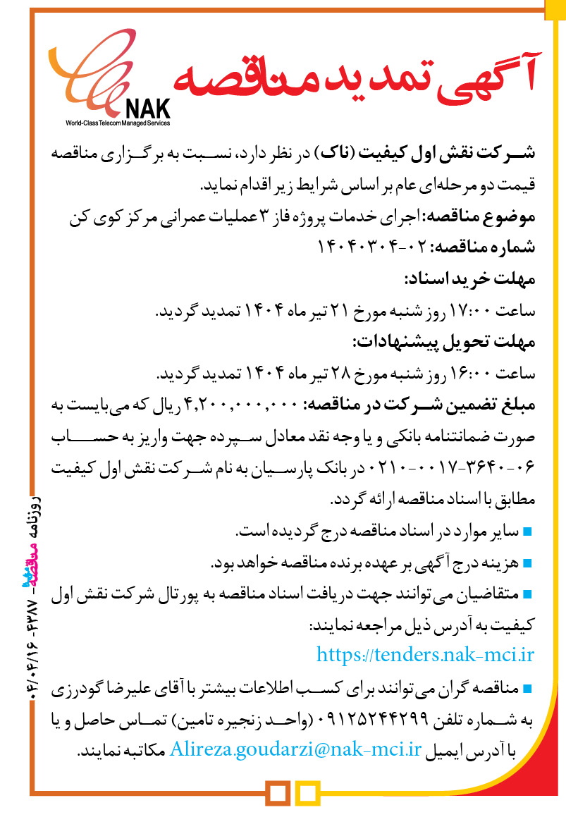 آگهی تمدید مناقصه شرکت نقش اول کیفیت (ناک) در نظر دارد، نسبت به برگزاری مناقصه قیمت دو مرحلهای عام بر اساس شرایط زیر اقدام نماید. موضوع مناقصه: اجرای خدمات پروژه فاز ۳ عملیات عمرانی مرکز کوی کن شماره مناقصه: ۰۲-۱۴۰۴۰۳۰۴ مهلت خرید اسناد: ساعت ۱۷:۰۰ روز شنبه مورخ ۲۱ تیر ماه ۱۴۰۴ تمدید گردید. […]