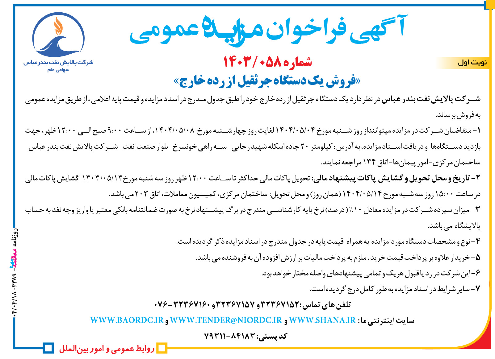 آگهی فراخوان مزایده عمومی ۰۵۸ /۱۴۰۳ «فروش یک دستگاه جرثقیل از رده خارج» شرکت پالایش نفت بندر عباس در نظر دارد یک دستگا ه جرثقیل از رده خارج خود را طبق جدول مندرج در اسناد مزایده و قیمت پایه اعلامی ، از طریق مزایده عمومی به فروش برساند. متقاضیان شرکت در مزایده میتواننداز روز شنبه […]