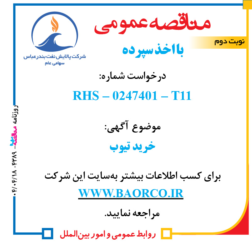 آگهی مناقصه عمومی با اخذ سپرده درخواست شماره: RHS – ۰۲۴۷۴۰۱ – T11 موضوع آگهی: خرید تیوب برای کسب اطلاعات بیشتر به سایت این شرکت WWW.BAORCO.IR مراجعه نمایید. روابط عمومی و امور بین الملل