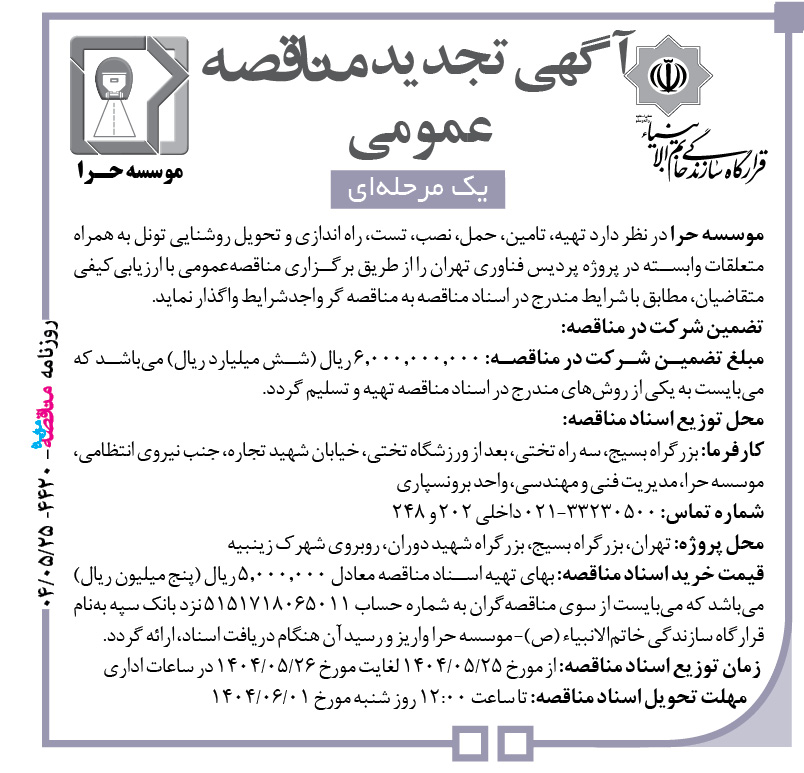 موسسه حرا در نظر دارد تهیه، تامین، حمل، نصب، تست، راه اندازی و تحویل روشنایی تونل به همراه متعلقات وابسته در پروژه پردیس فناوری تهران را از طریق برگزاری مناقصهعمومی با ارزیابیکیفی متقاضیان، مطابق با شرایط مندرج در اسناد مناقصه به مناقصه گر واجدشرایط واگذار نماید.