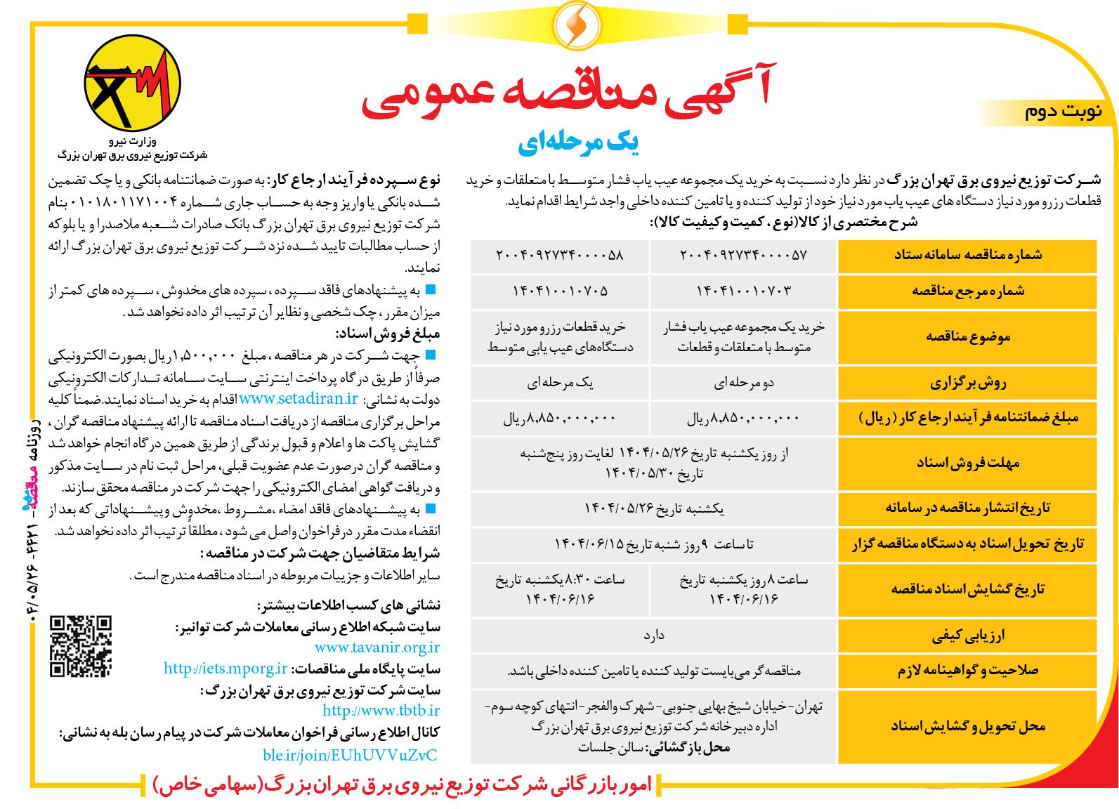 آگهي مناقصه عمومي دو مرحله اي شرکت توزیع نیروی برق تهران بزرگ در نظر دارد نسبت به خرید انواع ۲۰۰ دستگاه سکسیونر فوزیبل سنتی بدون فیوز مورد نیاز خود از تولید کننده داخلی واجد شرایط اقدام نماید . شرح مختصري از كالا(نوع ، كميت وكيفيت كالا): شماره مناقصه سامانه ستاد ۲۰۰۴۰۹۲۷۳۴۰۰۰۰۹۲ شماره مرجع مناقصه ۱۴۰۴۱۰۰۱۱۰۵۵ […]