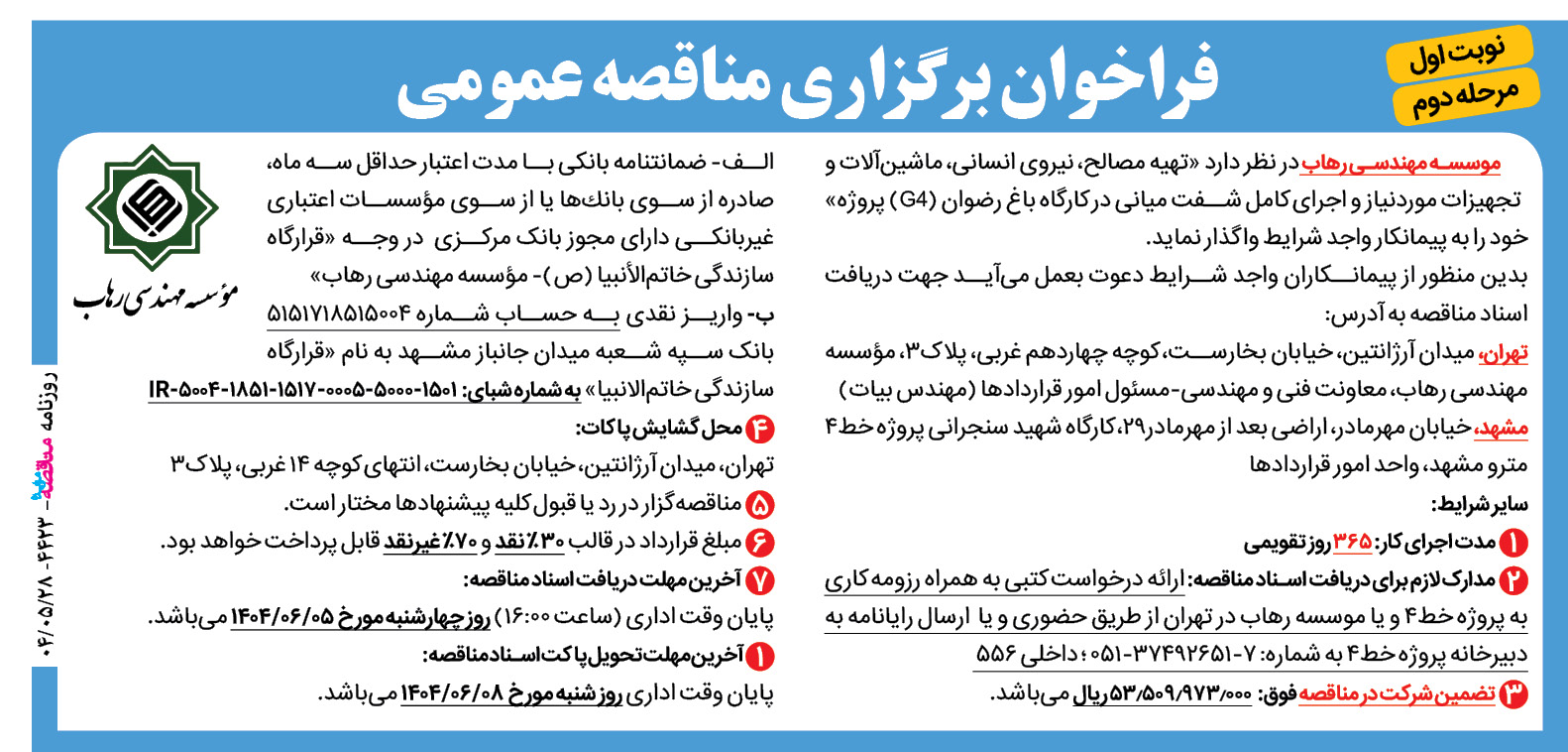 فراخوان برگزاری مناقصه عمومی مرحله دوم نوبت اول