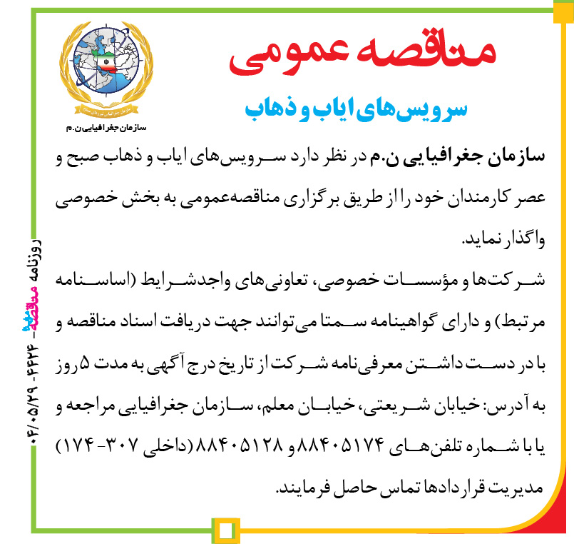 سازمان جغرافیایی ن.م در نظر دارد سرویسهای ایاب و ذهاب صبح و عصر کارمندان خود را از طریق برگزاری مناقصهعمومی به بخش خصوصی واگذار نماید.