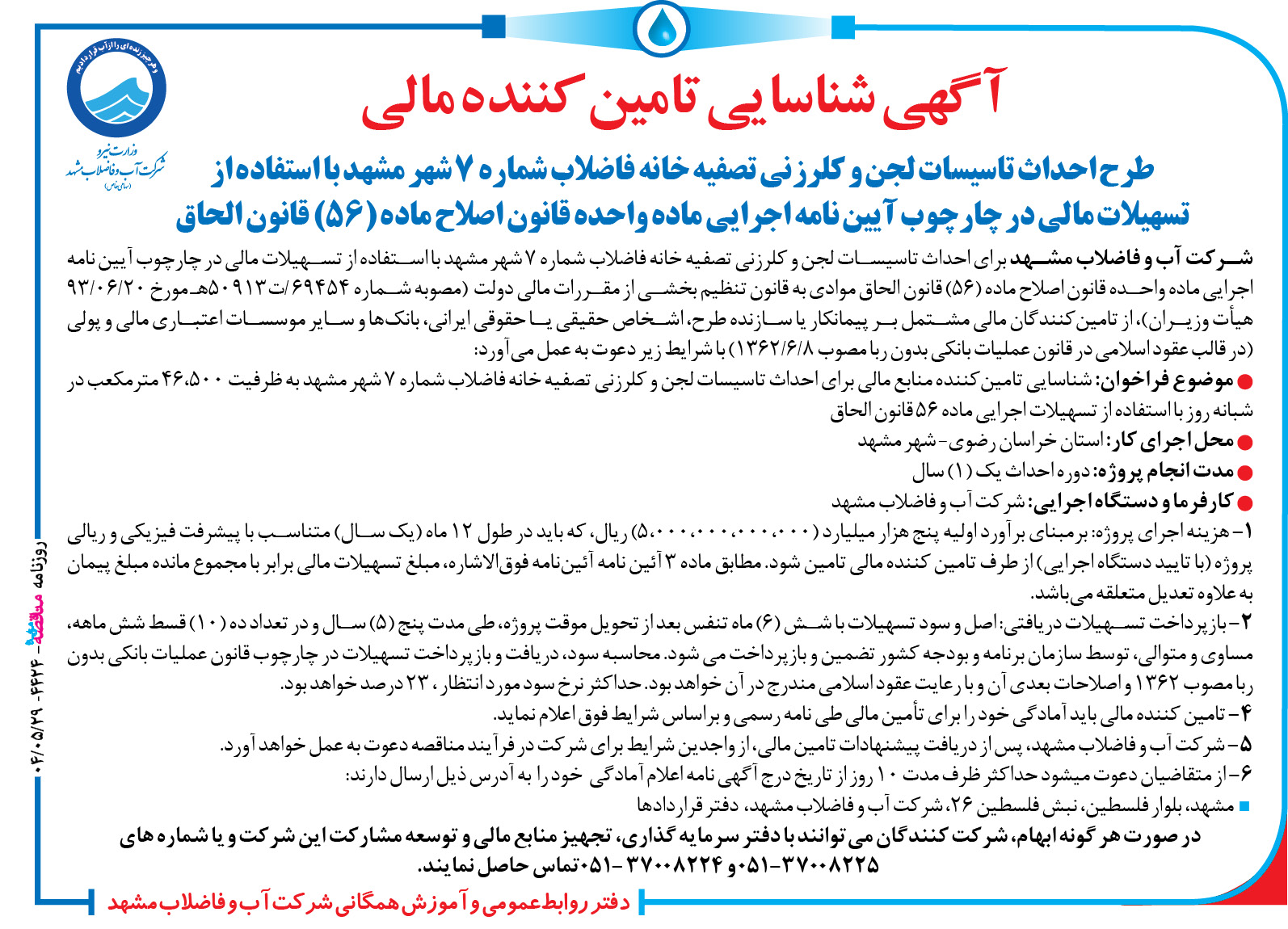 شرکت آب و فاضلاب مشهد برای احداث تاسيسات لجن و کلرزني تصفيه خانه فاضلاب شماره ۷ شهر مشهد با استفاده از تسهیلات مالی در چارچوب آیین نامه اجرایی ماده واحده قانون اصلاح ماده (۵۶) قانون الحاق موادی به قانون تنظیم بخشی از مقررات مالی دولت (مصوبه شماره ۶۹۴۵۴ /ت۵۰۹۱۳هـ مورخ ۲۰/۰۶/۹۳ هیأت وزیران)، از تامینکنندگان مالی مشتمل بر پیمانکار یا سازنده طرح، اشخاص حقیقی یا حقوقی ایرانی، بانکها و سایر موسسات اعتباری مالی و پولی (در قالب عقود اسلامی در قانون عملیات بانکی بدون ربا مصوب ۸/۶/۱۳۶۲) با شرایط زیر دعوت به عمل میآورد:
