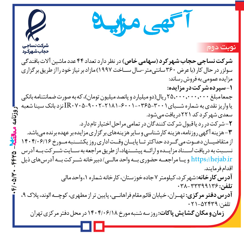 شرکت نساجی حجاب شهرکرد (سهامی خاص) در نظر دارد تعداد ۴۴ عدد ماشین آلات بافندگی سولزر در حال کار (با عرض ۳۶۰ سانتیمتر-سال ساخت ۱۹۹۷) مازاد بر نیاز خود را از طریق برگزاری مزایده عمومی به فروش رساند: