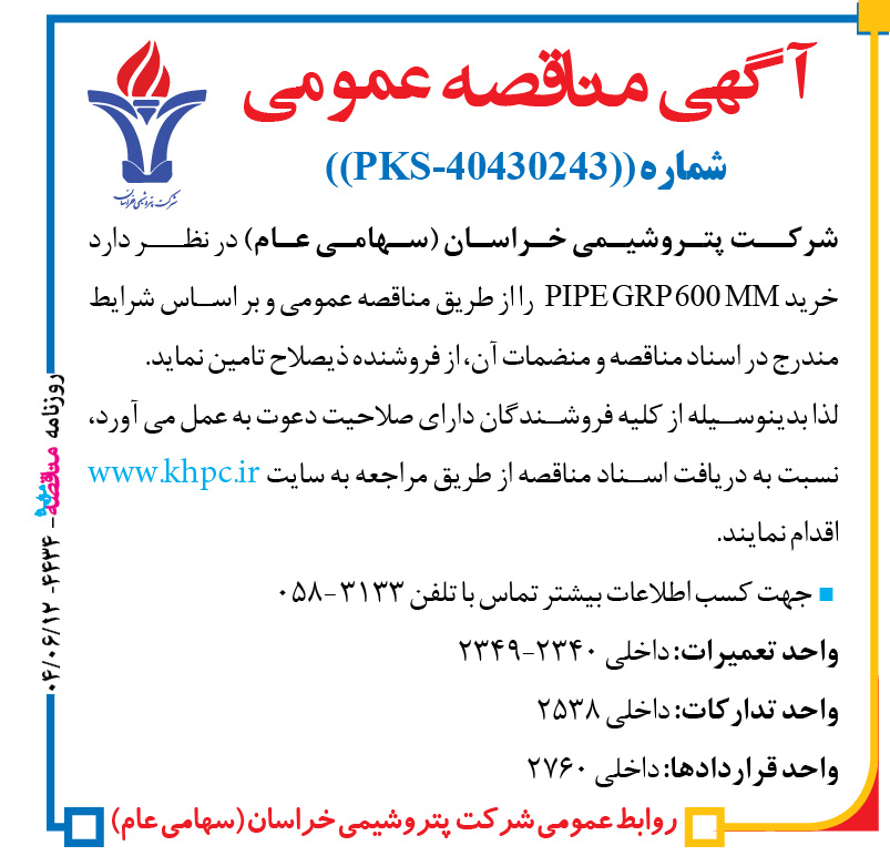 آگهي مناقصه عمومي شماره ((PKS-40430243)) شركت پتروشيمي خراسان (سهامي عام) در نظر دارد خرید PIPE GRP 600 MM را از طریق مناقصه عمومی و بر اساس شرایط مندرج در اسناد مناقصه و منضمات آن، از فروشنده ذیصلاح تامین نمايد. لذا بدينوسيله از كليه فروشندگان دارای صلاحیت دعوت به عمل مي آورد، نسبت به دريافت […]