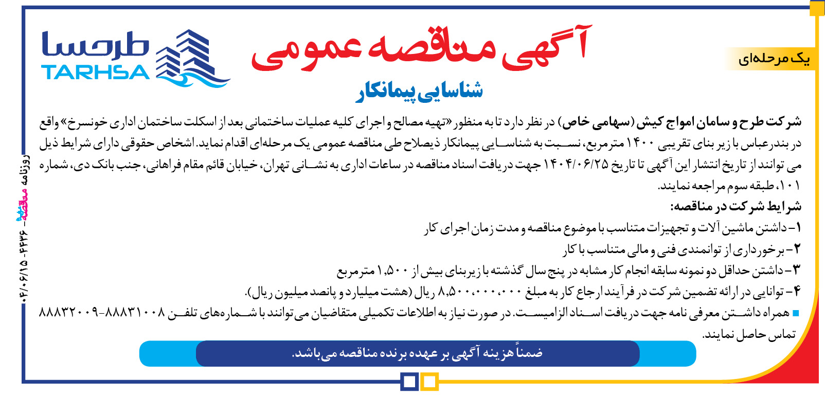 شرکت طرح و سامان امواج کیش (سهامی خاص) در نظر دارد تا به منظور«تهیه مصالح و اجراي کلیه عملیات ساختمانی بعد از اسکلت ساختمان اداری خونسرخ» واقع در بندرعباس با زیر بنای تقریبی ۱۴۰۰ مترمربع، نسبت به شناسایی پیمانکار ذیصلاح طی مناقصه عمومی یک مرحلهای اقدام نماید. اشخاص حقوقی دارای شرایط ذیل می توانند از تاریخ انتشار این آگهی تا تاریخ ۲۵/۰۶/۱۴۰۴ جهت دریافت اسناد مناقصه در ساعات اداری به نشانی تهران، خیابان قائم مقام فراهانی، جنب بانک دی، شماره ۱۰۱، طبقه سوم مراجعه نمایند.