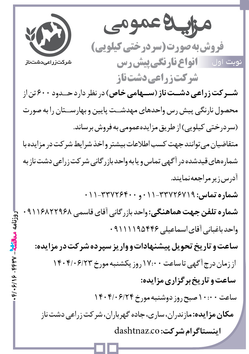شرکت زراعی دشت ناز (سهامی خاص) در نظر دارد حدود ۶۰۰ تن از محصول نارنگی پیش رس واحدهای مهدشت پایین و بهارستان را به صورت (سردرختی کیلویی) از طریق مزایدهعمومی به فروش برساند. متقاضیان میتوانند جهت کسب اطلاعات بیشتر و اخذ شرایط شرکت در مزایده با شمارههای قیدشده در آگهی تماس و یا به واحد بازرگانی شرکت زراعی دشت ناز به آدرس زیر مراجعه نمایند.