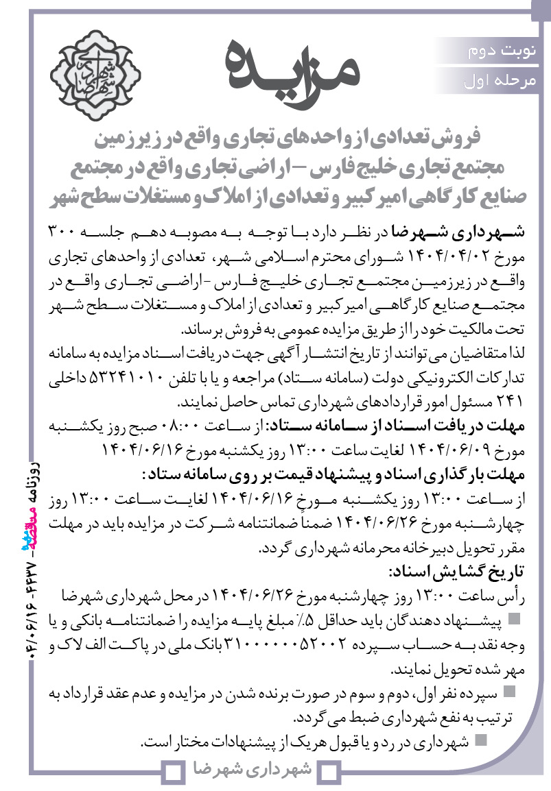 شهرداری شهرضا در نظر دارد با توجه به مصوبه دهم جلسه ۳۰۰ مورخ ۰۲/۰۴/۱۴۰۴ شورای محترم اسلامی شهر، تعدادی از واحدهای تجاری واقع در زیرزمین مجتمع تجاری خلیج فارس – اراضی تجاری واقع در مجتمع صنایع کارگاهی امیرکبیر و تعدادی از املاک و مستغلات سطح شهر تحت مالکیت خود را از طریق مزایده عمومی به فروش برساند.