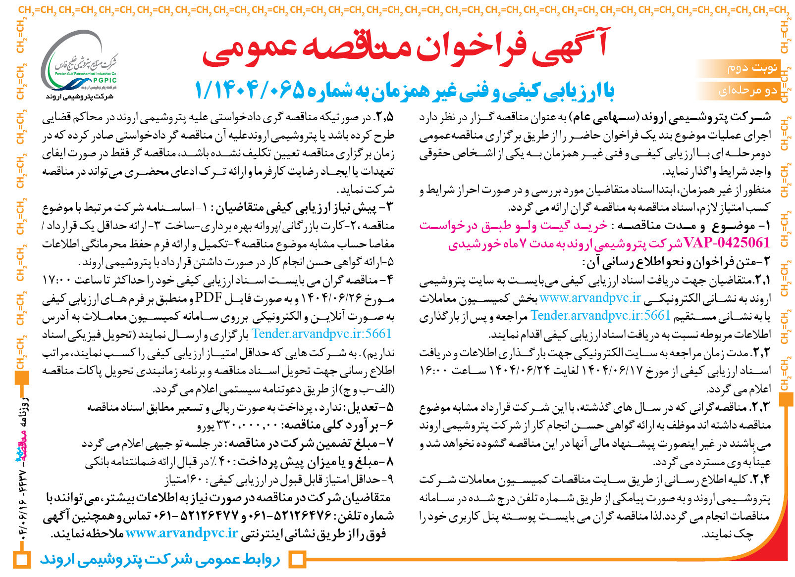 آگهی فراخوان مناقصه عمومی دو مرحله ای با ارزیابی کیفی و فنی غیر همزمان به شماره ۰۶۵/۱۴۰۴/۱ شرکت پتروشیمی اروند (سهامی عام) به عنوان مناقصه گزار در نظر دارد اجرای عملیات موضوع بند یک فراخوان حاضر را از طریق برگزاری مناقصه عمومی دومرحله ای با ارزیابی کیفی و فنی غیر همزمان به یکی از اشخاص […]