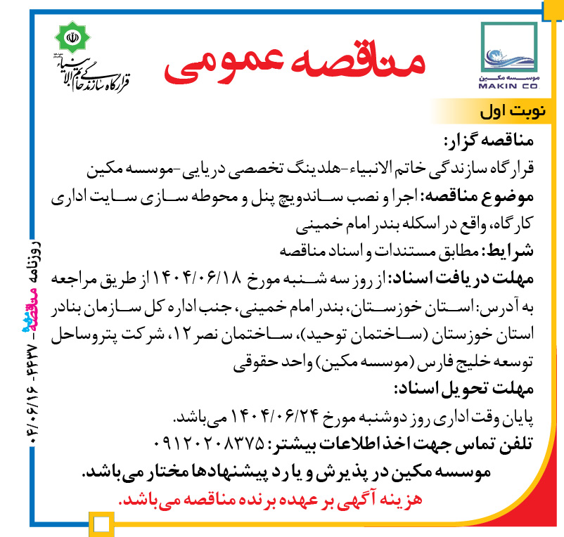مناقصه گزار: قرارگاه سازندگی خاتم الانبیاء-هلدینگ تخصصی دریایی-موسسه مکین