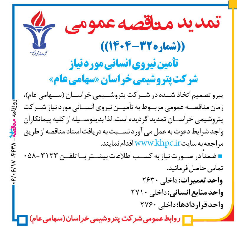 پيرو تصميم اتخاذ شده در شركت پتروشيمي خراسان (سهامي عام)، زمان مناقصه عمومي مربوط به تأمین نیروی انساني مورد نياز شركت پتروشيمي خراسان تمديد گرديده است. لذا بدينوسيله از كليه پیمانکاران واجد شرایط دعوت به عمل مي آورد نسبت به دريافت اسناد مناقصه از طريق مراجعه به سايتwww.khpc.ir اقدام نمايند. ضمناً در صورت نياز به كسب اطلاعات بيشتر با تلفن ۳۱۳۳ -۰۵۸ تماس حاصل فرمائيد.