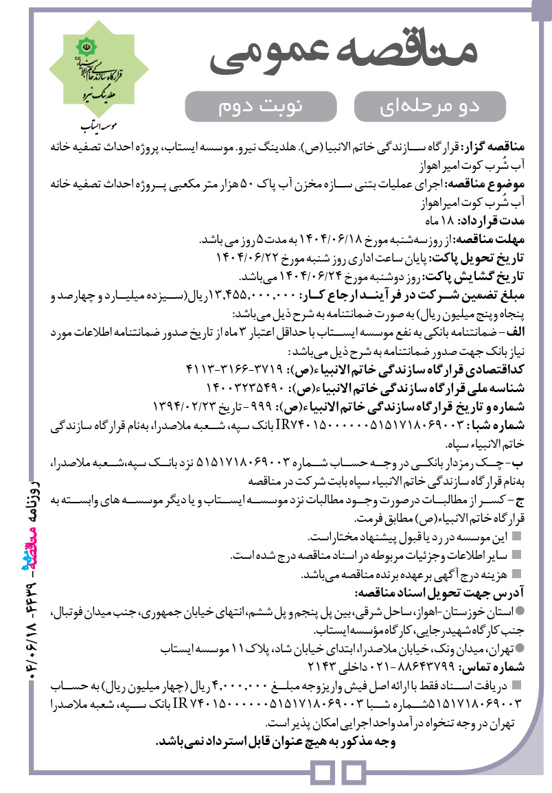 مناقصه گزار: قرارگاه سازندگی خاتم الانبیا (ص). هلدینگ نیرو. موسسه ایستاب، پروژه احداث تصفیه خانه آب شُرب کوت امیر اهواز