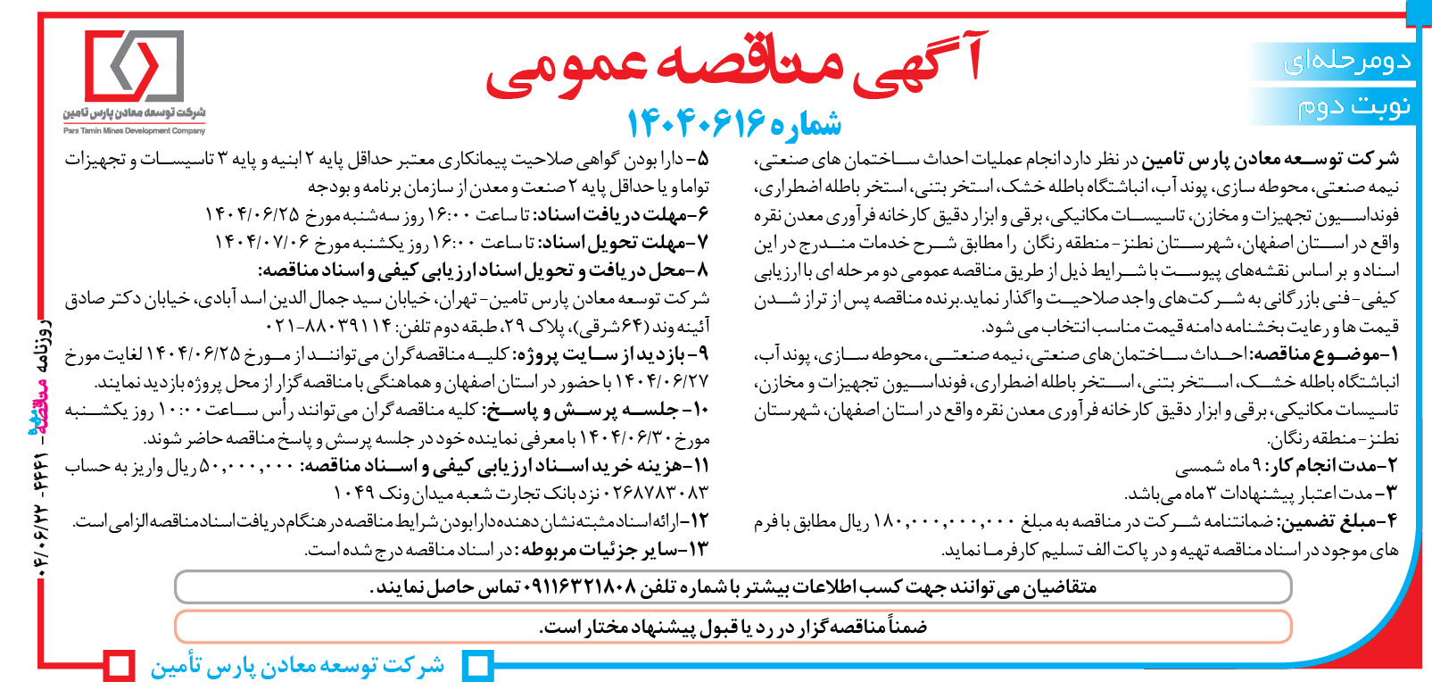 شركت توسعه معادن پارس تامین در نظر دارد انجام عملیات احداث ساختمان های صنعتی، نیمه صنعتی، محوطه سازی، پوند آب، انباشتگاه باطله خشک، استخر بتنی، استخر باطله اضطراری، فونداسیون تجهیزات و مخازن، تاسیسات مکانیکی، برقی و ابزار دقیق کارخانه فرآوری معدن نقره واقع در استان اصفهان، شهرستان نطنز – منطقه رنگان را مطابق شرح خدمات مندرج در اين اسناد و بر اساس نقشههای پیوست با شرايط ذيل از طريق مناقصه عمومی دو مرحله ای با ارزیابی کیفی- فنی بازرگانی به شركتهاي واجد صلاحيت واگذار نمايد.برنده مناقصه پس از تراز شدن قیمت ها و رعایت بخشنامه دامنه قیمت مناسب انتخاب می شود.
