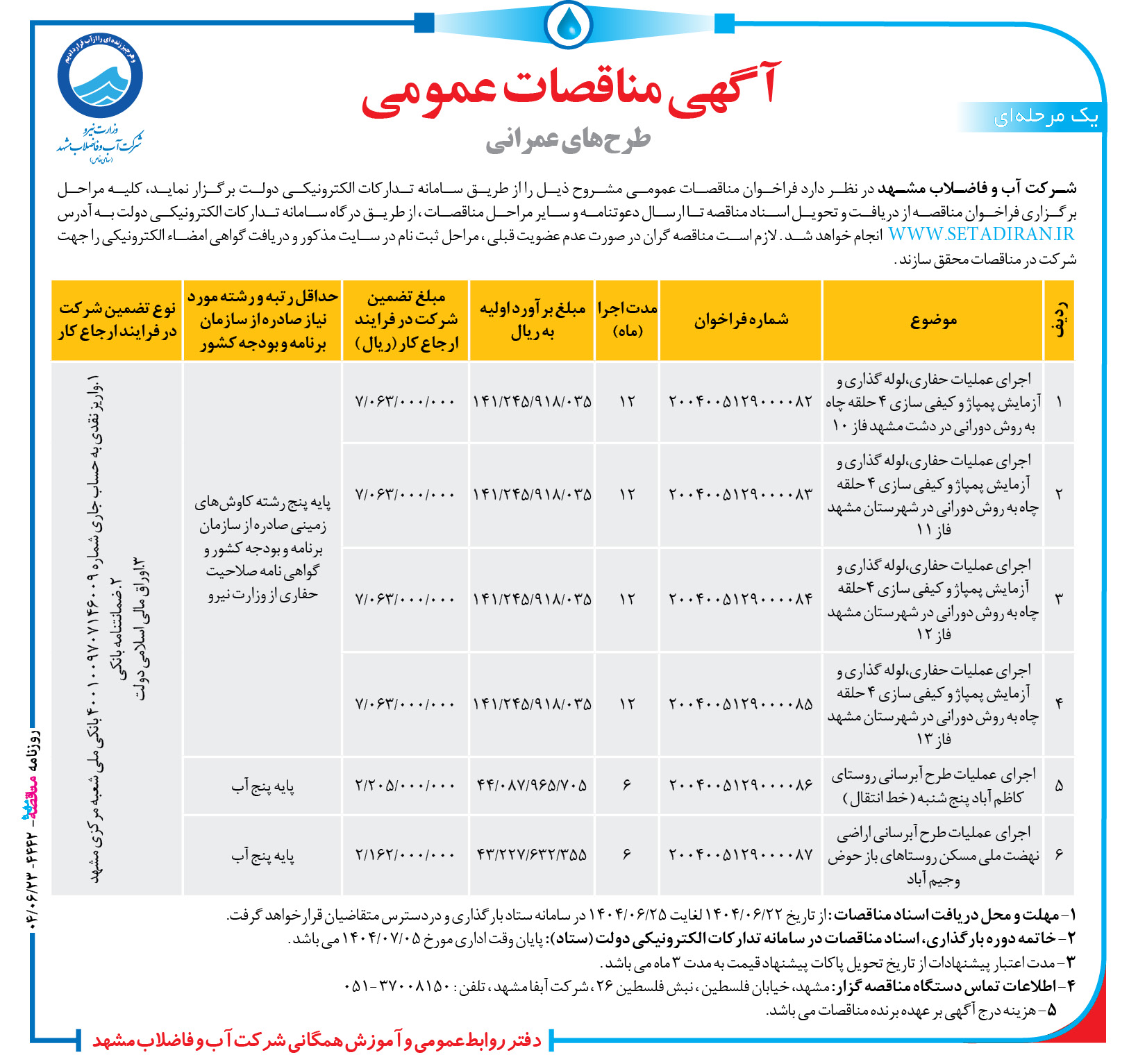 شرکت آب و فاضلاب مشهد در نظر دارد فراخوان مناقصات عمومی مشروح ذیل را از طریق سامانه تدارکات الکترونیکی دولت برگزار نماید، کلیه مراحل برگزاری فراخوان مناقصه از دریافت و تحویل اسناد مناقصه تا ارسال دعوتنامه و سایر مراحل مناقصات ، از طریق درگاه سامانه تدارکات الکترونیکی دولت به آدرس WWW.SETADIRAN.IR انجام خواهد شد . لازم است مناقصه گران در صورت عدم عضویت قبلی ، مراحل ثبت نام در سایت مذکور و دریافت گواهی امضاء الکترونیکی را جهت شرکت در مناقصات محقق سازند .