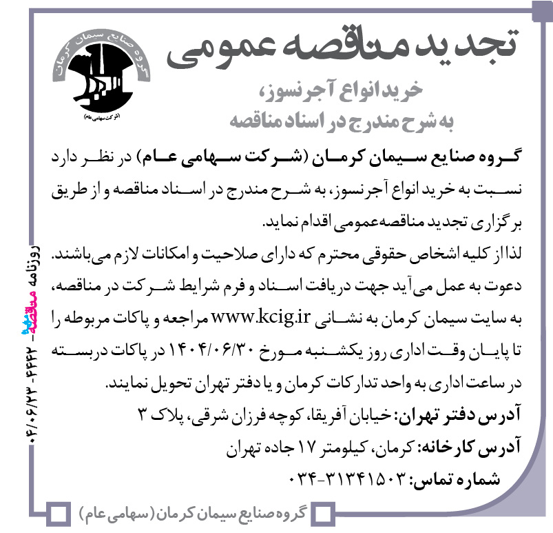 گروه صنایع سیمان کرمان (شرکت سهامی عام) در نظر دارد نسبت به خرید انواع آجرنسوز، به شرح مندرج در اسناد مناقصه و از طریق برگزاری تجدید مناقصهعمومی اقدام نماید. لذا از کلیه اشخاص حقوقی محترم که دارای صلاحیت و امکانات لازم میباشند. دعوت به عمل میآید جهت دریافت اسناد و فرم شرایط شرکت در مناقصه، به سایت سیمان کرمان به نشانی www.kcig.ir مراجعه و پاکات مربوطه را تا پایان وقت اداری روز یکشنبه مورخ ۳۰/۰۶/۱۴۰۴ در پاکات دربسته در ساعت اداری به واحد تدارکات کرمان و یا دفتر تهران تحویل نمایند.