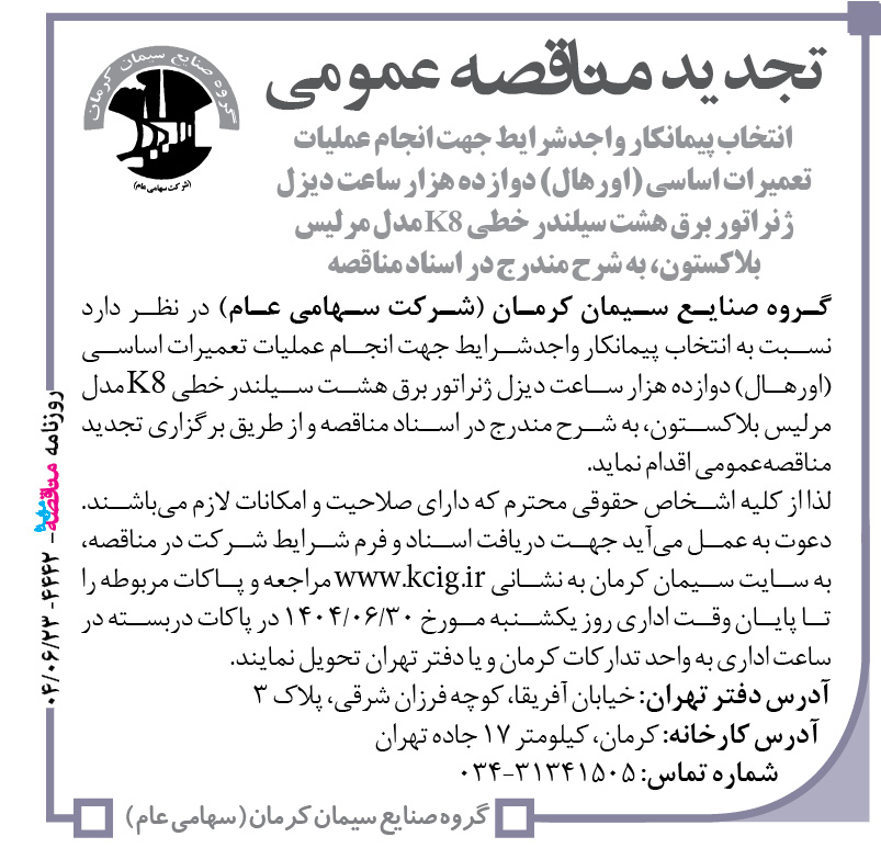 گروه صنایع سیمان کرمان (شرکت سهامی عام) در نظر دارد نسبت به انتخاب پیمانکار واجدشرایط جهت انجام عملیات تعمیرات اساسی (اورهال) دوازده هزار ساعت دیزل ژنراتور برق هشت سیلندر خطی K8 مدل مرلیس بلاکستون، به شرح مندرج در اسناد مناقصه و از طریق برگزاری تجدید مناقصهعمومی اقدام نماید. لذا از کلیه اشخاص حقوقی محترم که دارای صلاحیت و امکانات لازم میباشند. دعوت به عمل میآید جهت دریافت اسناد و فرم شرایط شرکت در مناقصه، به سایت سیمان کرمان به نشانی www.kcig.ir مراجعه و پاکات مربوطه را تا پایان وقت اداری روز یکشنبه مورخ ۳۰/۰۶/۱۴۰۴ در پاکات دربسته در ساعت اداری به واحد تدارکات کرمان و یا دفتر تهران تحویل نمایند.