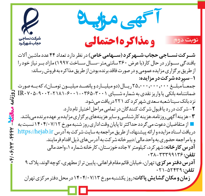 شرکت نساجی حجاب شهرکرد (سهامی خاص) در نظر دارد تعداد ۴۴ عدد ماشین آلات بافندگی سولزر در حال کار(با عرض ۳۶۰ سانتیمتر-سال ساخت ۱۹۹۷) مازاد بر نیاز خود را از طریق برگزاری مزایده عمومی و در صورت فاقد برنده بودن از طریق مذاکره به فروش رساند: