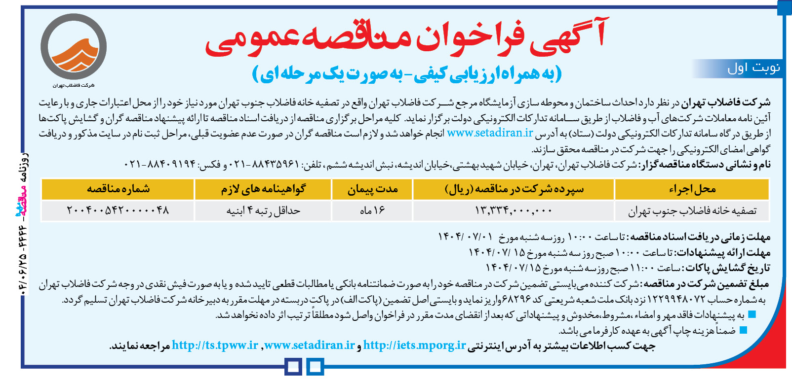 تصفیه خانه فاضلاب جنوب تهران ۱۳٫۳۳۴٫۰۰۰٫۰۰۰ ۱۶ ماه حداقل رتبه ۴ابنیه ۲۰۰۴۰۰۵۴۲۰۰۰۰۰۴۸