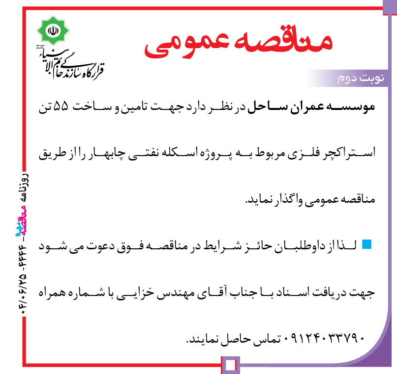موسسه عمران ساحل در نظر دارد جهت تامین و ساخت ۵۵ تن استراکچر فلزی مربوط به پروژه اسکله نفتی چابهار را از طریق مناقصه عمومی واگذار نماید.
