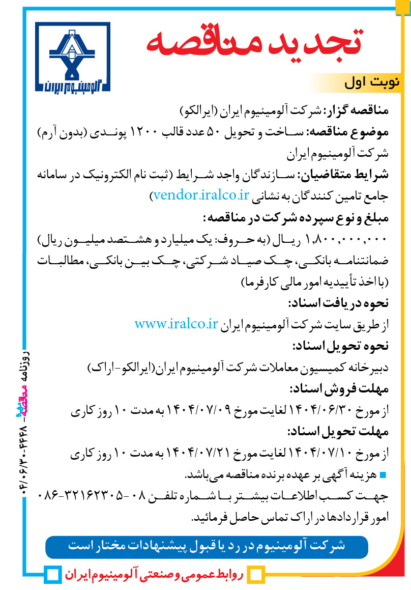 موضوع مناقصه: ساخت و تحویل ۵۰ عدد قالب ۱۲۰۰ پوندی (بدون آرم) شرکت آلومینیوم ایران