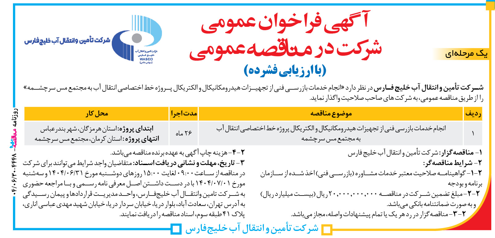 شرکت تأمین و انتقال آب خلیج فارس در نظر دارد « انجام خدمات بازرسی فنی از تجهیزات هیدرومکانیکال و الکتریکال پروژه خط اختصاصی انتقال آب به مجتمع مس سرچشمه » را از طريق مناقصه عمومي، به شركت هاي صاحب صلاحيت واگذار نمايد.