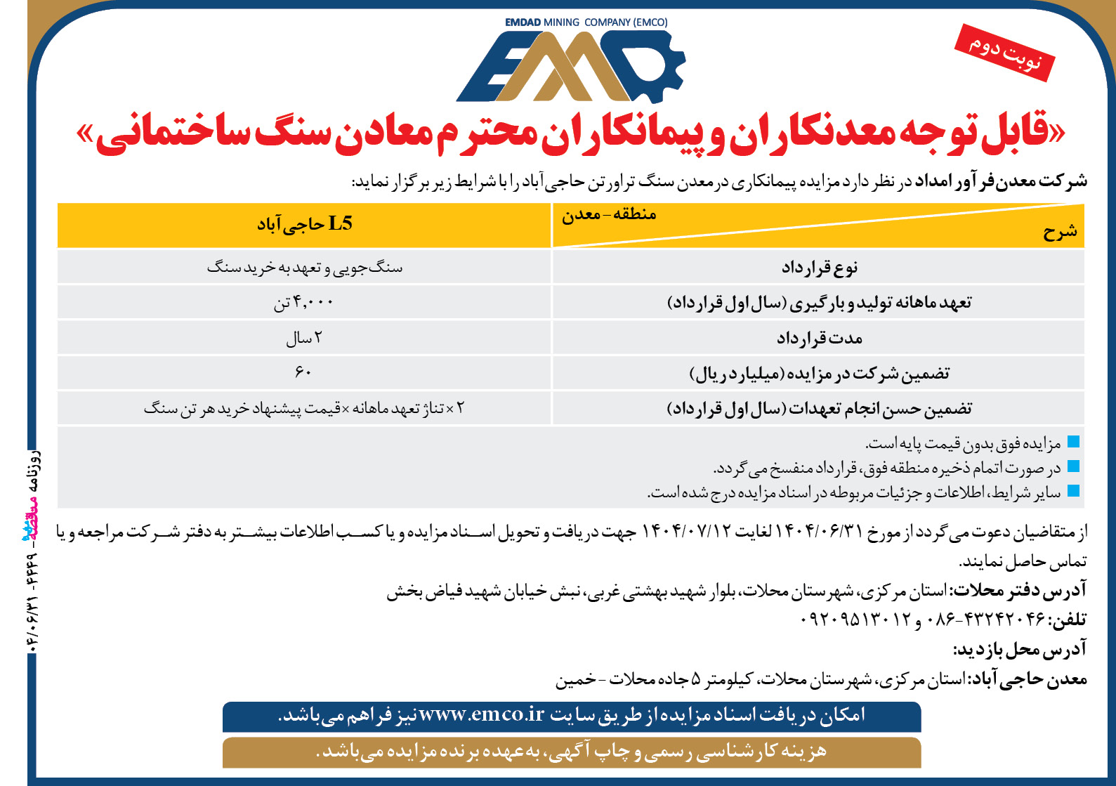 شرکت معدنفرآور امداد در نظر دارد مزایده پیمانکاری درمعدن سنگ تراورتن حاجیآباد را با شرایط زیر برگزار نماید: