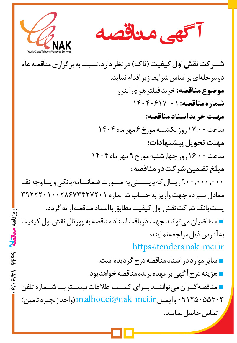 آگهی مناقصه شرکت نقش اول کیفیت (ناک) در نظر دارد، نسبت به برگزاری مناقصه عام دو مرحلهای بر اساس شرایط زیر اقدام نماید. موضوع مناقصه: خرید فیلتر هوای اینرو شماره مناقصه: ۰۱-۱۴۰۴۰۶۱۷ مهلت خرید اسناد مناقصه: ساعت ۱۷:۰۰ روز یکشنبه مورخ ۶ مهر ماه ۱۴۰۴ مهلت تحویل پیشنهادات: ساعت ۱۶:۰۰ روز چهارشنبه مورخ ۹ […]