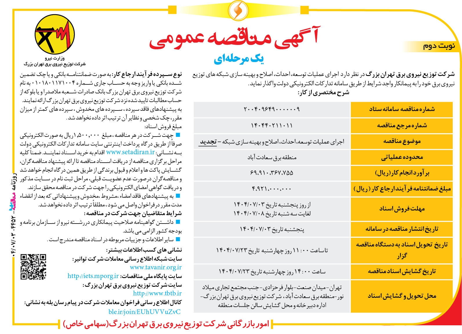 آگهي مناقصه عمومي یک مرحله ای شرکت توزیع نیروی برق تهران بزرگ در نظر دارد اجراي عمليات توسعه و احداث و اصلاح و بهینه سازی شبکه (PC) خود را به پیمانکار واجد شرایط از طریق سامانه تدارکات الکترونیکی دولت واگذار نماید . شرح مختصري از کار: شماره مناقصه سامانه ستاد ۲۰۰۴۰۹۵۰۶۶۰۰۰۰۰۵ شماره مرجع مناقصه ۱۴۰۴۳۰۷۱۱۲۱۳ […]