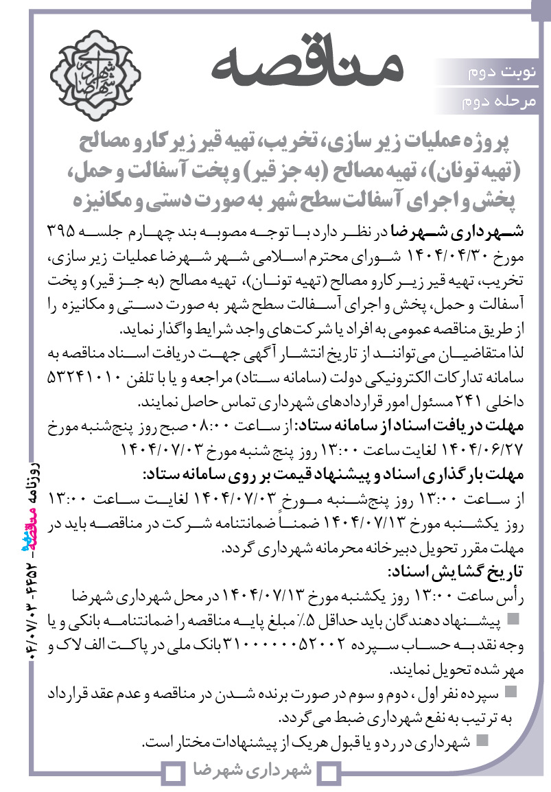 شهرداری شهرضا در نظر دارد با توجه مصوبه بند چهارم جلسه ۳۹۵ مورخ ۳۰/۰۴/۱۴۰۴ شورای محترم اسلامی شهر شهرضا عملیات زیر سازی، تخریب، تهیه قیر زیرکارو مصالح (تهیه تونان)، تهیه مصالح (به جز قیر) و پخت آسفالت و حمل، پخش و اجرای آسفالت سطح شهر به صورت دستی و مکانیزه را از طریق مناقصه عمومی به افراد یا شرکتهای واجد شرایط واگذار نماید.
