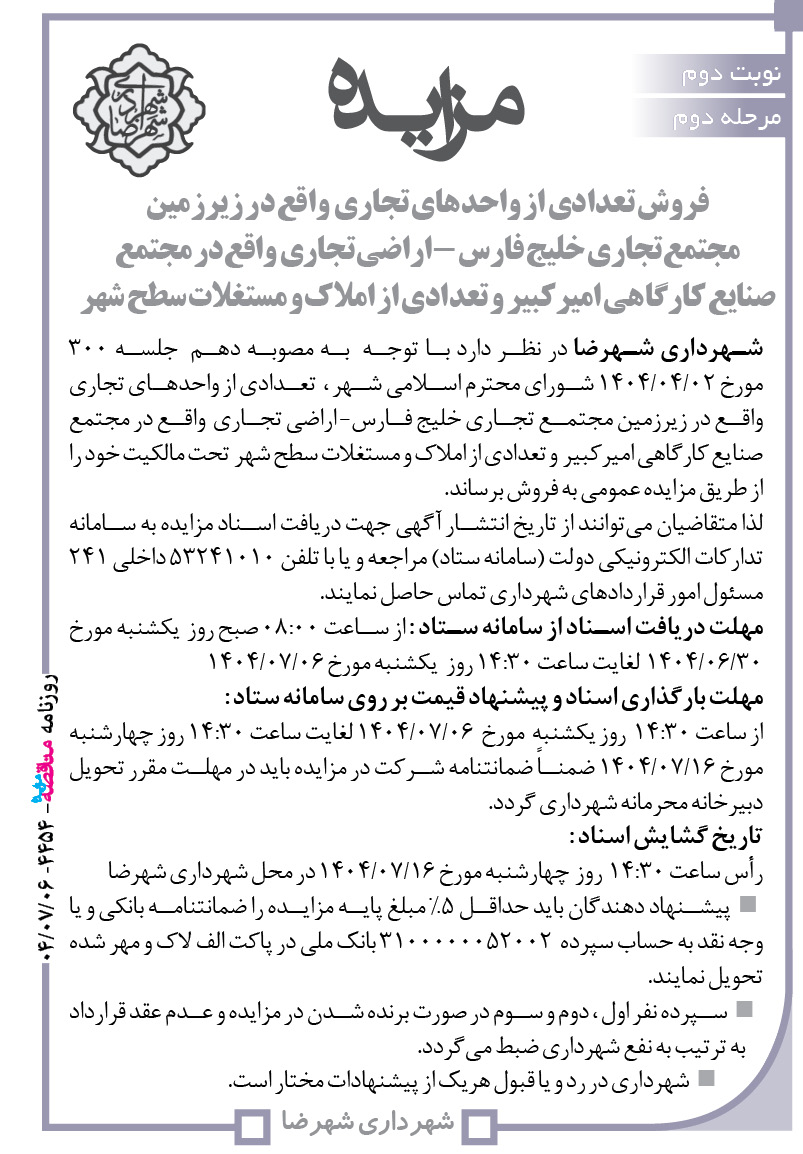 شهرداری شهرضا در نظر دارد با توجه به مصوبه دهم جلسه ۳۰۰ مورخ ۰۲/۰۴/۱۴۰۴ شورای محترم اسلامی شهر ، تعدادی از واحدهای تجاری واقع در زیرزمین مجتمع تجاری خلیج فارس – اراضی تجاری واقع در مجتمع صنایع کارگاهی امیرکبیر و تعدادی از املاک و مستغلات سطح شهر تحت مالکیت خود را از طریق مزایده عمومی به فروش برساند.