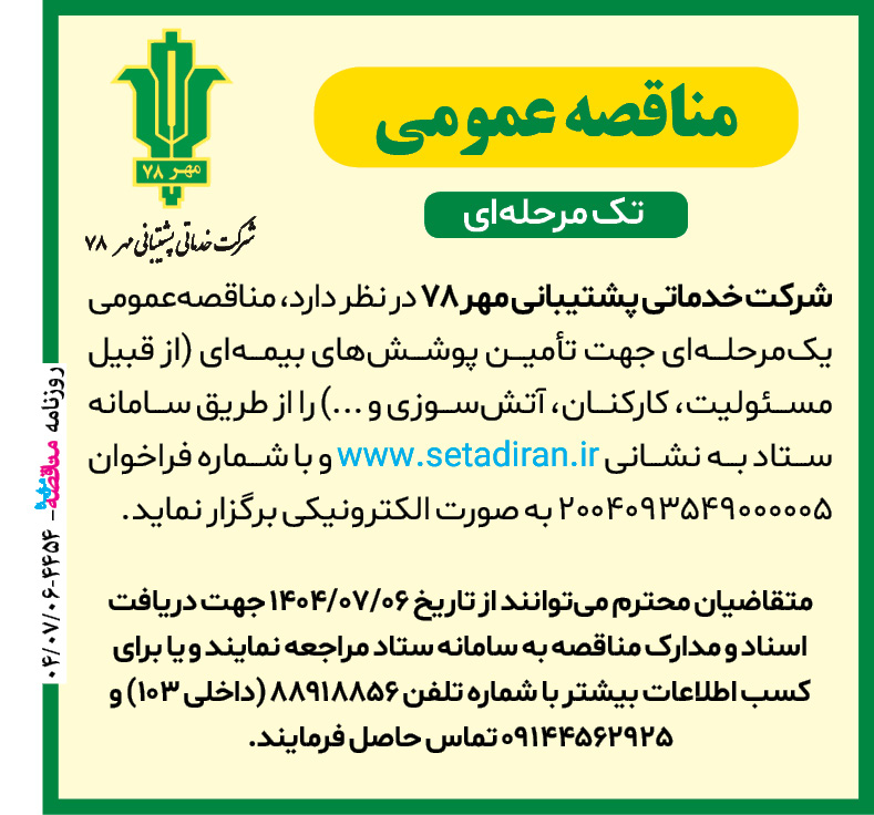شرکت خدماتی پشتیبانی مهر ۷۸ در نظر دارد،مناقصه عمومی یکمرحلهای جهت تأمین پوششهای بیمهای (از قبیل مسئولیت، کارکنان، آتشسوزی و …) را از طریق سامانه ستاد به نشانی www.setadiran.ir و با شماره فراخوان ۲۰۰۴۰۹۳۵۴۹۰۰۰۰۰۵ به صورت الکترونیکی برگزار نماید.