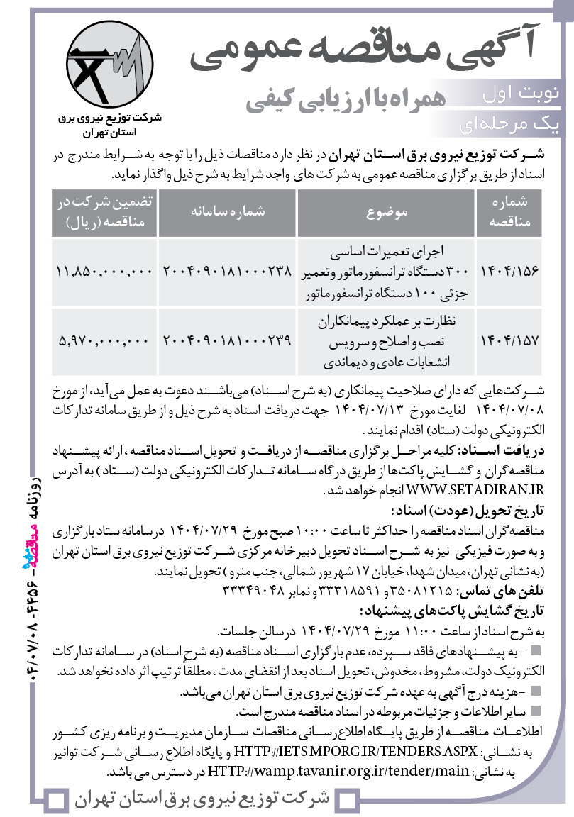 – هزينه درج آگهي به عهده شرکت توزیع نیروی برق استان تهران ميباشد.