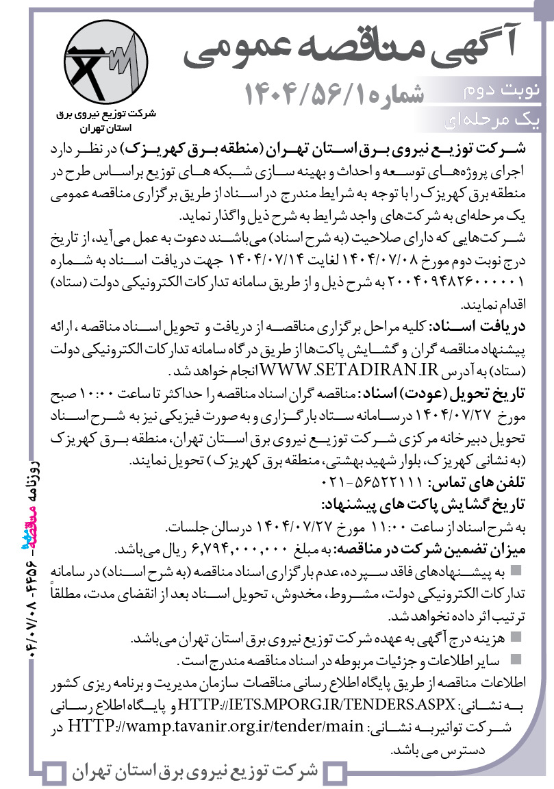 – هزينه درج آگهي به عهده شرکت توزیع نیروی برق استان تهران ميباشد.