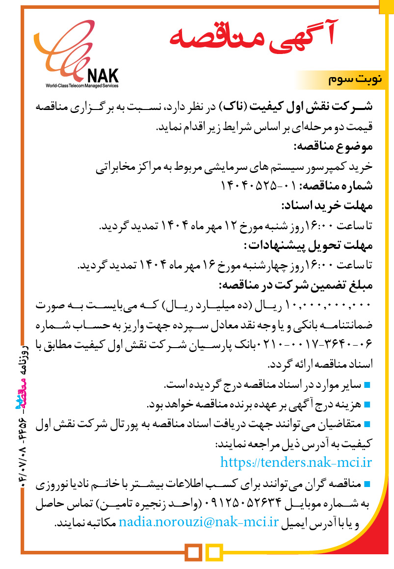 مناقصه گران میتوانند برای کسب اطلاعات بیشتر با خانم نادیا نوروزی به شماره موبایل ۰۹۱۲۵۰۵۲۶۳۴ (واحد زنجیره تامین) تماس حاصل و یا با آدرس ایمیل nadia.norouzi@nak-mci.ir مکاتبه نمایند.
