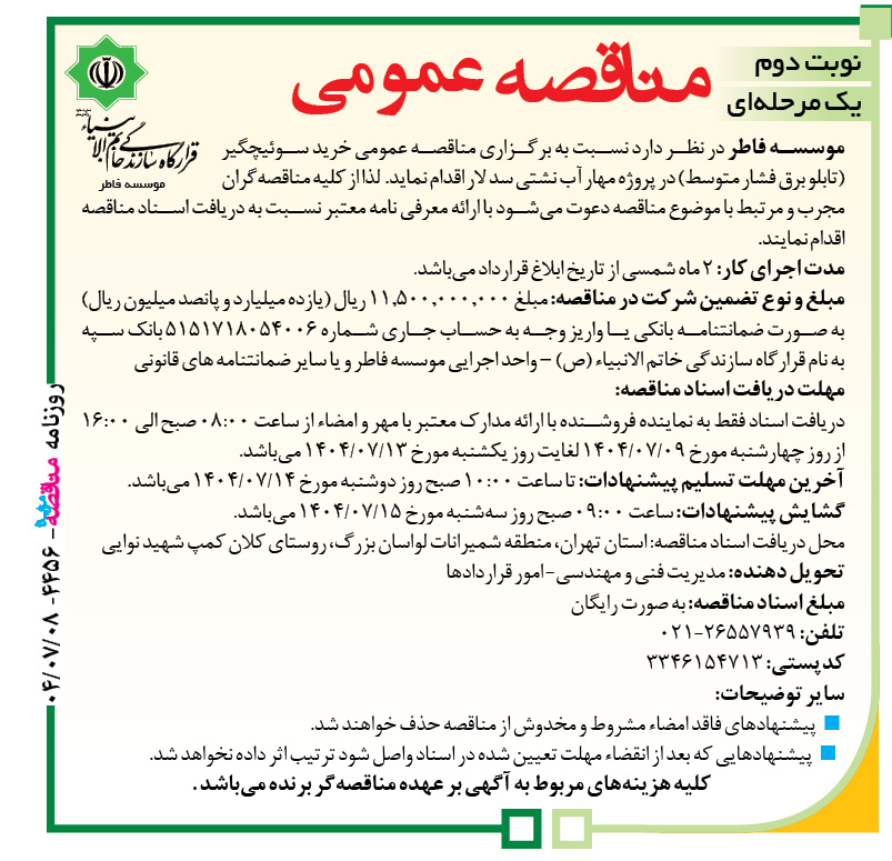موسسه فاطر در نظر دارد نسبت به برگزاری مناقصه عمومی خرید سوئیچگیر (تابلو برق فشار متوسط) در پروژه مهار آب نشتی سد لار اقدام نماید. لذا از کلیه مناقصهگران مجرب و مرتبط با موضوع مناقصه دعوت میشود با ارائه معرفی نامه معتبر نسبت به دریافت اسناد مناقصه اقدام نمایند.