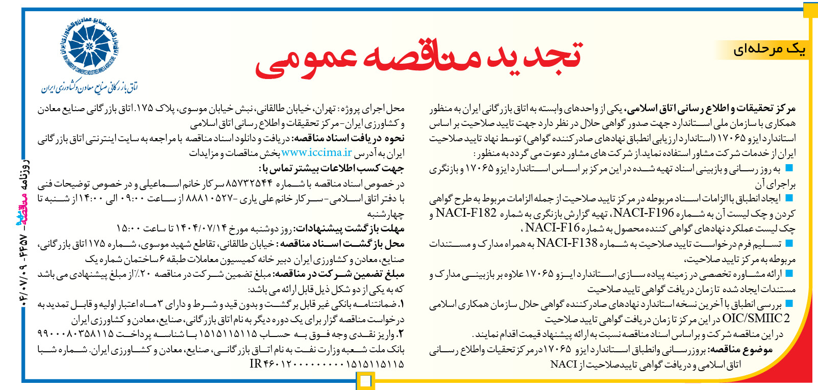 موضوع مناقصه: بروزرساني وانطباق استاندارد ايزو ١٧٠٦٥درمركزتحقيات واطﻼع رساني اتاق اسلامی و دريافت گواهي تاييدصلاحیت ازNACI