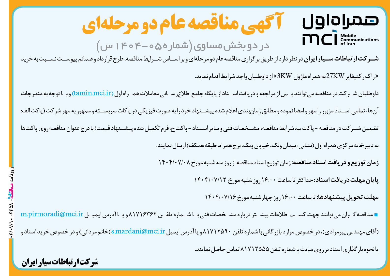 شرکت ارتباطات سیار ایران در نظر دارد از طریق برگزاری مناقصه عام دو مرحلهای و بر اساس شرایط مناقصه، طرح قرارداد و ضمائم پیوست نسبت به خرید « راک رکتیفایر ۲۷KW به همراه ماژول ۳KW » از داوطلبان واجد شرایط اقدام نماید.