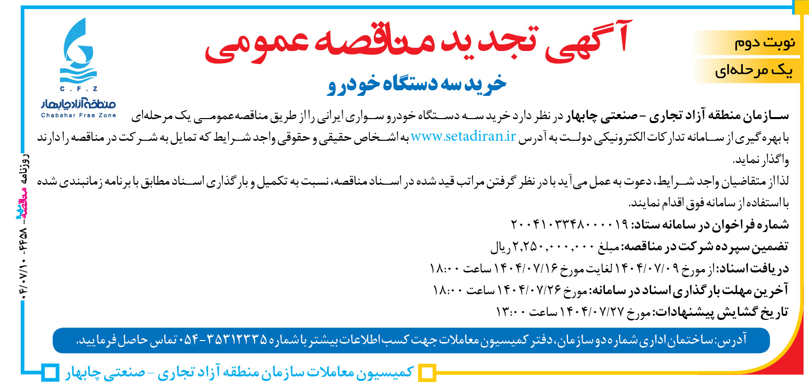 سازمان منطقه آزاد تجارى – صنعتى چابهار در نظر دارد خريد سه دستگاه خودرو سوارى ايرانى را از طريق مناقصهعمومى يك مرحلهاى با بهرهگيرى از سامانه تداركات الكترونيكى دولت به آدرس www.setadiran.ir به اشخاص حقيقى و حقوقى واجد شرايط كه تمايل به شركت در مناقصه را دارند واگذار نمايد.