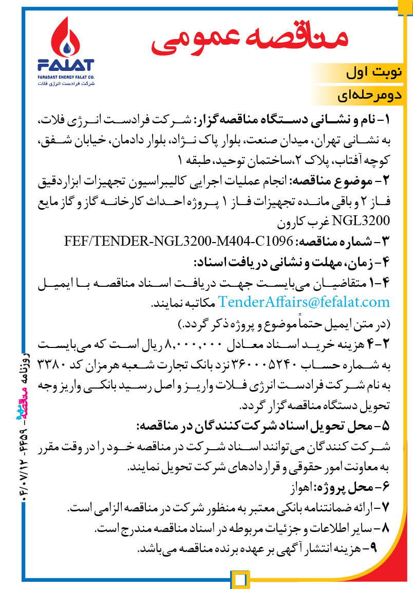 مناقصه عمومی دو مرحلهای نام و نشانی دستگاه مناقصهگزار: شرکت فرادست انرژی فلات، به نشانی تهران، میدان صنعت، بلوار پاک نژاد، بلوار دادمان، خیابان شفق، کوچه آفتاب، پلاک ۲،ساختمان توحید، طبقه ۱ موضوع مناقصه: انجام عملیات اجرایی کالیبراسیون تجهیزات ابزاردقیق فاز ۲ و باقی مانده تجهیزات فاز ۱ پروژه احداث کارخانه گاز و گاز مایع […]