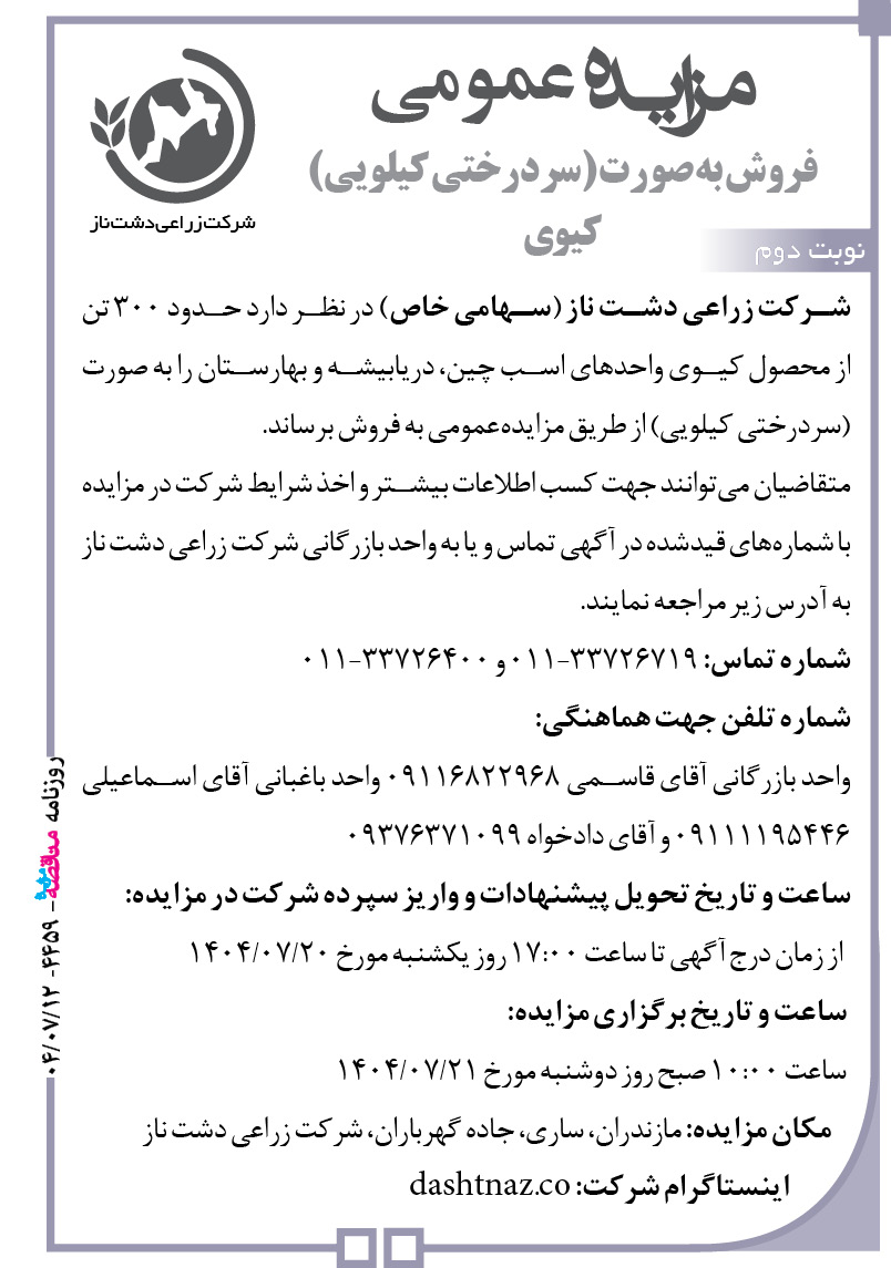 شرکت زراعی دشت ناز (سهامی خاص) در نظر دارد حدود ۳۰۰ تن از محصول کیوی واحدهای اسب چین، دریابیشه و بهارستان را به صورت (سردرختی کیلویی) از طریق مزایدهعمومی به فروش برساند. متقاضیان میتوانند جهت کسب اطلاعات بیشتر و اخذ شرایط شرکت در مزایده با شمارههای قیدشده در آگهی تماس و یا به واحد بازرگانی شرکت زراعی دشت ناز به آدرس زیر مراجعه نمایند.