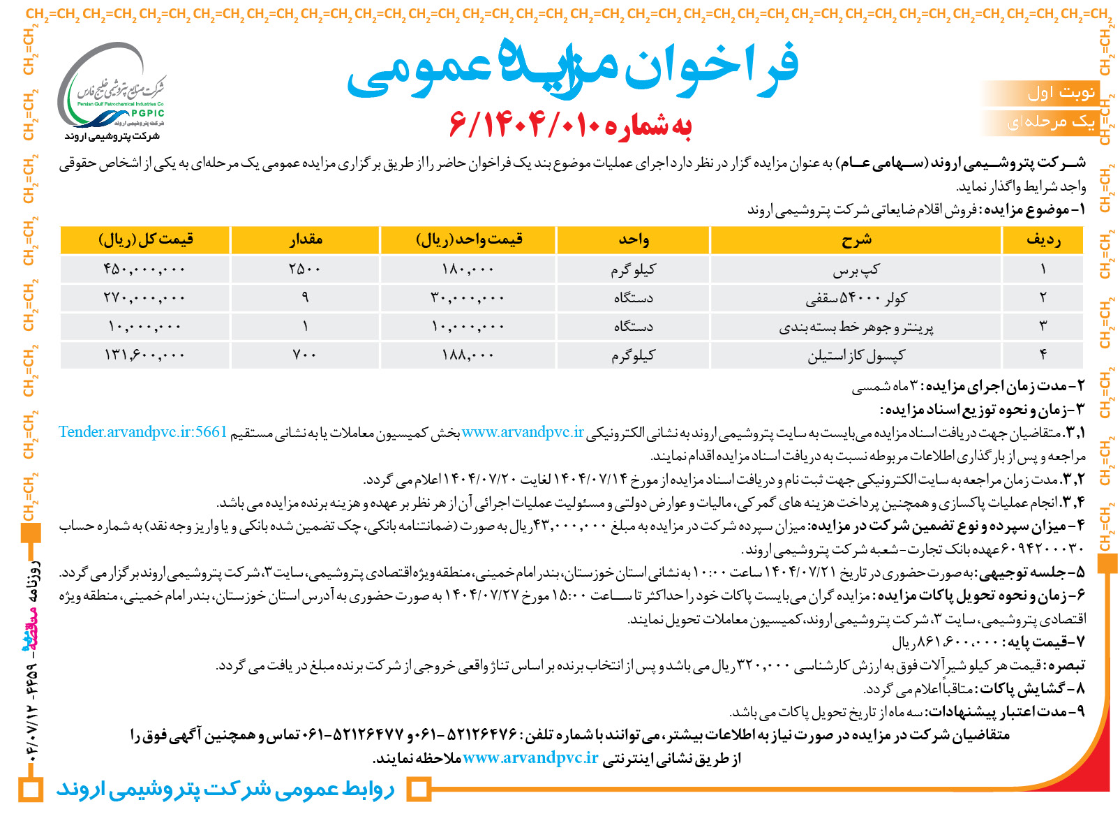 ۱- موضوع مزایده : فروش اقلام ضایعاتی شرکت پتروشیمی اروند