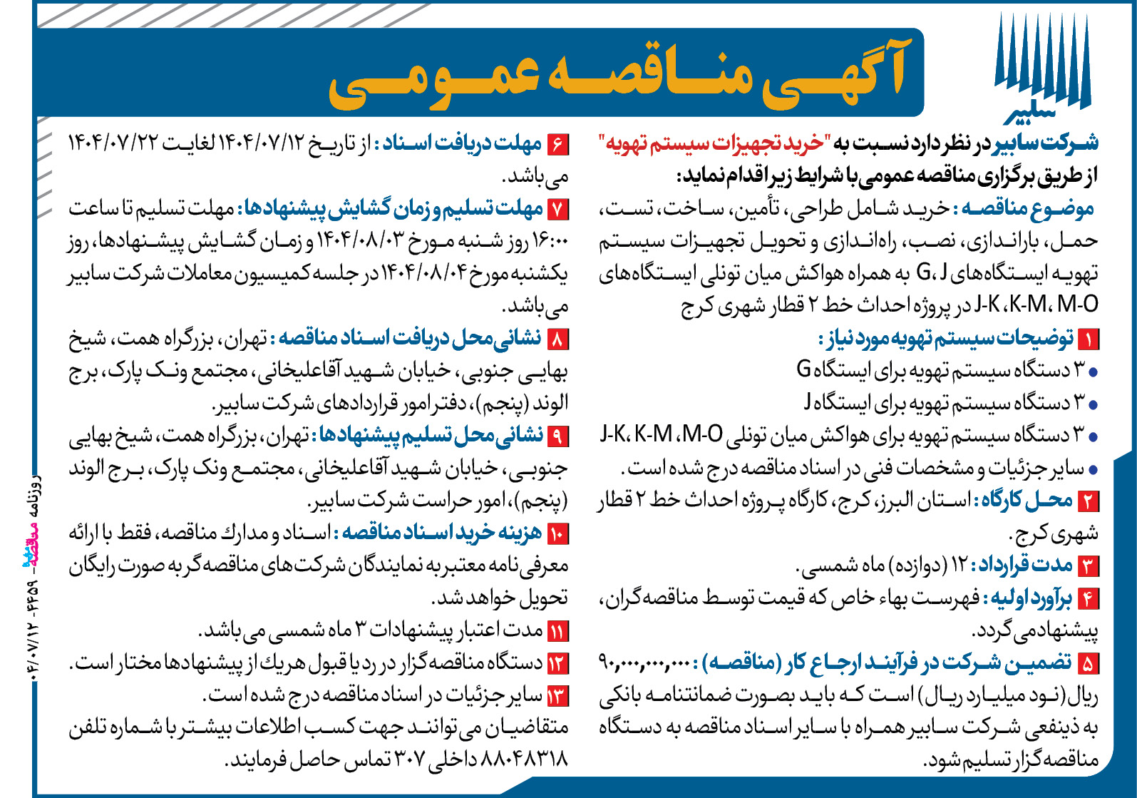 ۴۴۵۹ مناقصه – شرکت سابیر – خرید تجهیزات سیستم تهویه
