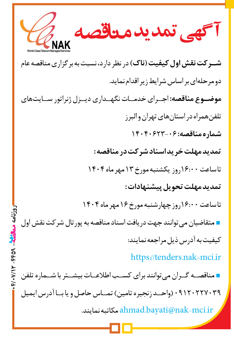 مناقصه گران میتوانند برای کسب اطلاعات بیشتر با شماره تلفن ۰۹۱۲۰۲۲۷۰۳۹ (واحد زنجیره تامین) تماس حاصل و یا با آدرس ایمیل ahmad.bayati@nak-mci.ir مکاتبه نمایند.
