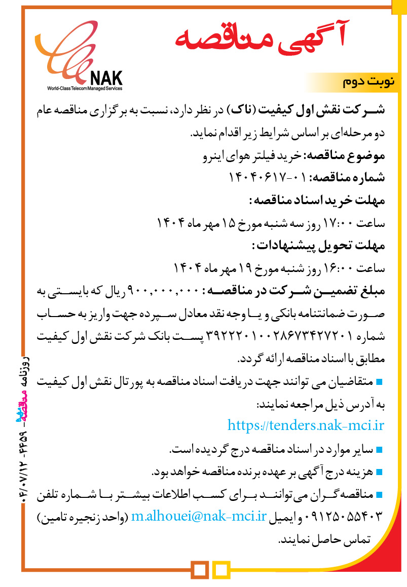آگهی مناقصه (نوبت دوم) شرکت نقش اول کیفیت (ناک) در نظر دارد، نسبت به برگزاری مناقصه عام دو مرحلهای بر اساس شرایط زیر اقدام نماید. موضوع مناقصه: خرید فیلتر هوای اینرو شماره مناقصه: ۰۱-۱۴۰۴۰۶۱۷ مهلت خرید اسناد مناقصه : ساعت ۱۷:۰۰ روز سه شنبه مورخ ۱۵ مهر ماه ۱۴۰۴ مهلت تحویل پیشنهادات : ساعت ۱۶:۰۰ […]