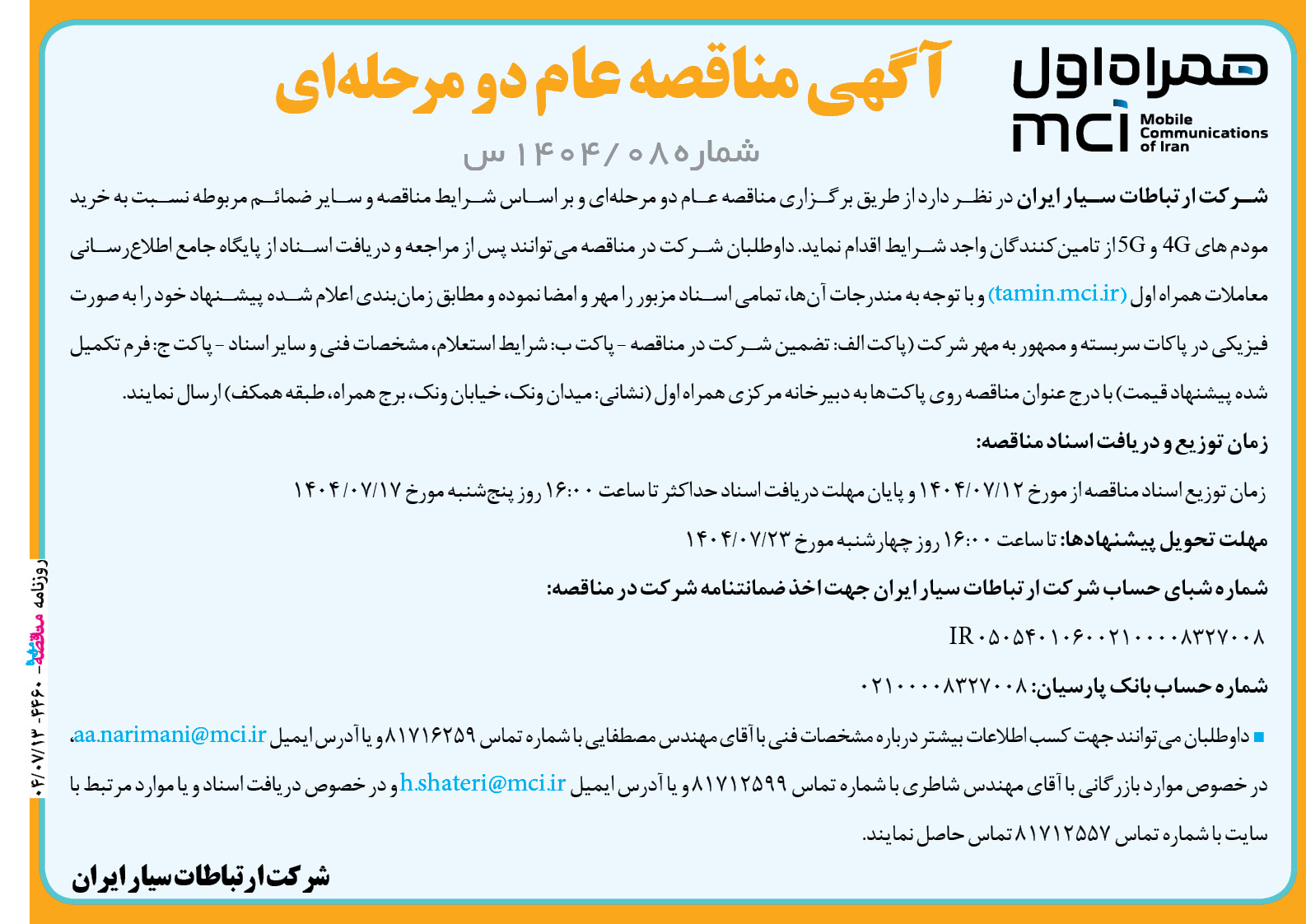 شرکت ارتباطات سیار ایران در نظر دارد از طریق برگزاری مناقصه عام دو مرحلهای و بر اساس شرایط مناقصه و سایر ضمائم مربوطه نسبت به خرید مودم های۴G و ۵G از تامینکنندگان واجد شرایط اقدام نماید. داوطلبان شرکت در مناقصه میتوانند پس از مراجعه و دریافت اسناد از پایگاه جامع اطلاعرسانی معاملات همراه اول (tamin.mci.ir) و با توجه به مندرجات آنها، تمامی اسناد مزبور را مهر و امضا نموده و مطابق زمانبندی اعلام شده پیشنهاد خود را به صورت فیزیکی در پاکات سربسته و ممهور به مهر شرکت (پاکت الف: تضمین شرکت در مناقصه – پاکت ب: شرایط استعلام، مشخصات فنی و سایر اسناد – پاکت ج: فرم تکمیل شده پیشنهاد قیمت) با درج عنوان مناقصه روی پاکتها به دبیرخانه مرکزی همراه اول (نشانی: میدان ونک، خیابان ونک، برج همراه، طبقه همکف) ارسال نمایند.