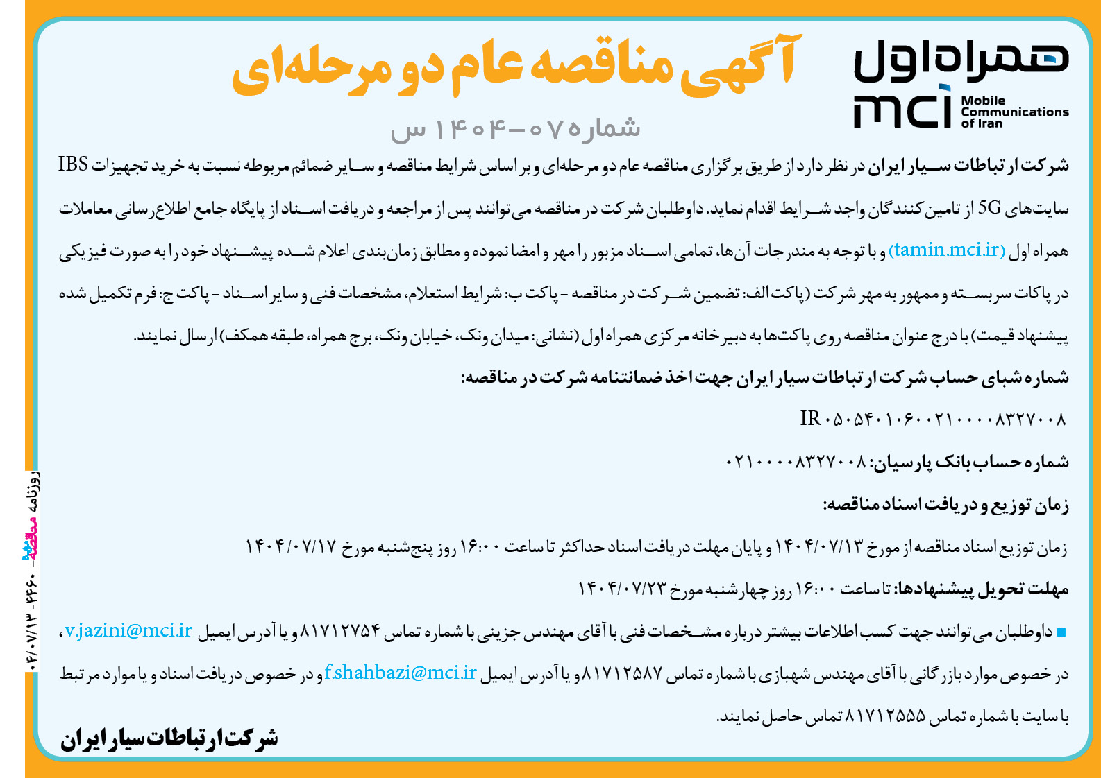 شرکت ارتباطات سیار ایران در نظر دارد از طریق برگزاری مناقصه عام دو مرحلهای و بر اساس شرایط مناقصه و سایر ضمائم مربوطه نسبت به خرید تجهیزات IBS سایت های ۵G از تامینکنندگان واجد شرایط اقدام نماید. داوطلبان شرکت در مناقصه میتوانند پس از مراجعه و دریافت اسناد از پایگاه جامع اطلاعرسانی معاملات همراه اول (tamin.mci.ir) و با توجه به مندرجات آنها، تمامی اسناد مزبور را مهر و امضا نموده و مطابق زمانبندی اعلام شده پیشنهاد خود را به صورت فیزیکی در پاکات سربسته و ممهور به مهر شرکت (پاکت الف: تضمین شرکت در مناقصه – پاکت ب: شرایط استعلام، مشخصات فنی و سایر اسناد – پاکت ج: فرم تکمیل شده پیشنهاد قیمت) با درج عنوان مناقصه روی پاکتها به دبیرخانه مرکزی همراه اول (نشانی: میدان ونک، خیابان ونک، برج همراه، طبقه همکف) ارسال نمایند.