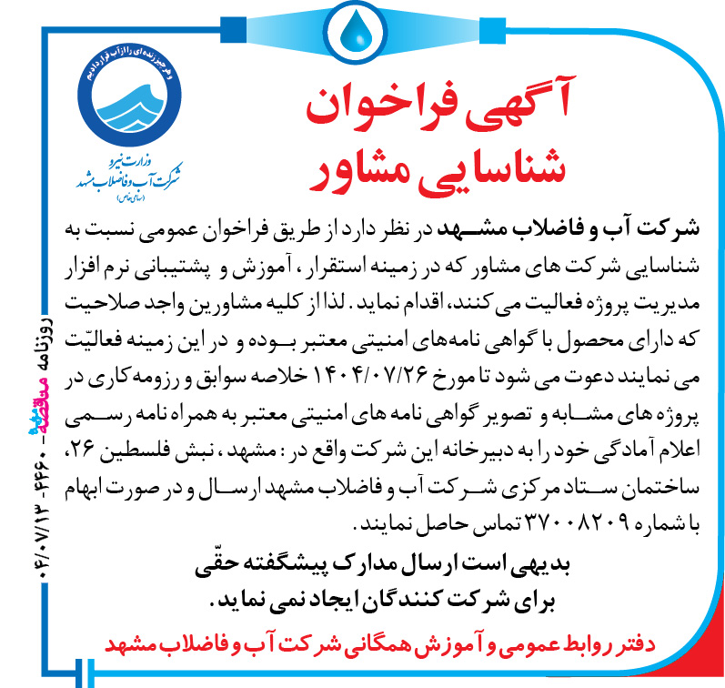 شرکت آب و فاضلاب مشهد در نظر دارد از طریق فراخوان عمومی نسبت به شناسایی شرکت های مشاور که در زمینه استقرار ، آموزش و پشتیبانی نرم افزار مدیریت پروژه فعالیت میکنند ، اقدام نماید . لذا از کلیه مشاورین واجد صلاحیت که دارای محصول با گواهی نامه های امنیتی معتبر بوده و در این زمینه فعالیّت می نمایند دعوت می شود تا مورخ ۲۶/۰۷/۱۴۰۴ خلاصه سوابق و رزومه کاری در پروژه های مشابه و تصویر گواهی نامه های امنیتی معتبر به همراه نامه رسمی اعلام آمادگی خود را به دبیرخانه این شرکت واقع در : مشهد ، نبش فلسطین ۲۶ ، ساختمان ستاد مرکزی شرکت آب و فاضلاب مشهد ارسال و در صورت ابهام با شماره ۳۷۰۰۸۲۰۹ تماس حاصل نمایند . بدیهی است ارسال مدارک پیشگفته حقّی برای شرکت کنندگان ایجاد نمی نماید .