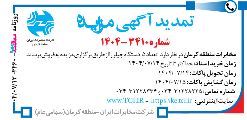 تمدید آگهی مزایده شماره۳۴۱۰ -۱۴۰۴ مخابرات منطقه کرمان در نظر دارد تعداد ۵ دستگاه چیلر را از طریق برگزاری مزایده به فروش برساند. زمان خرید اسناد حداکثر تا تاریخ ۱۴/۰۷/۱۴۰۴ زمان تحویل پاکات: ۱۴/۰۷/۱۴۰۴ زمان گشایش پاکات: ۱۵/۰۷/۱۴۰۴ شماره تماس ۳۱۲۲۸۲۲۵-۰۳۴ و ۳۱۲۲۸۳۳۴-۰۳۴ سایت اینترنتی: www.TCI.IR _ https://ke.tci.ir